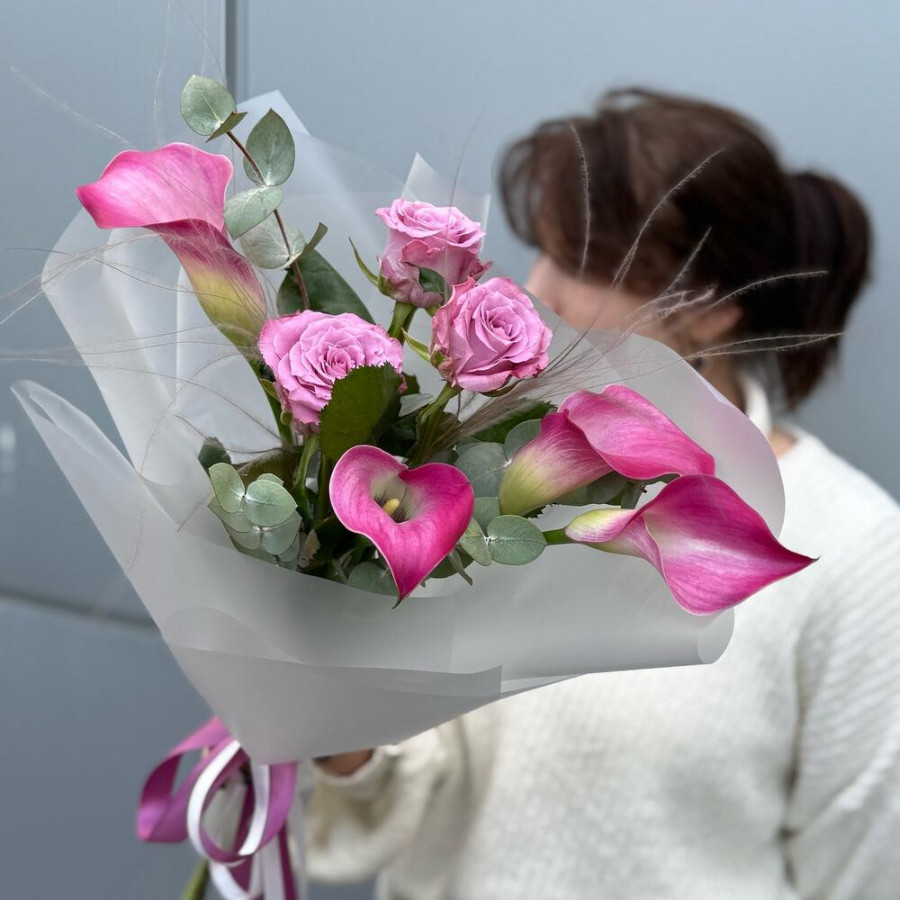 На фото букет «розовый восторг». В составе: калла 4 шт, роза 3 шт, зелень 2 шт, эвкалипт 1 шт, дизайнерская упаковка 1 шт, атласная лента 1 шт, . Все цветы свежие и ароматные, букет красиво оформлен и отлично подходит для подарка. Доступна доставка цветов или самовывоз.